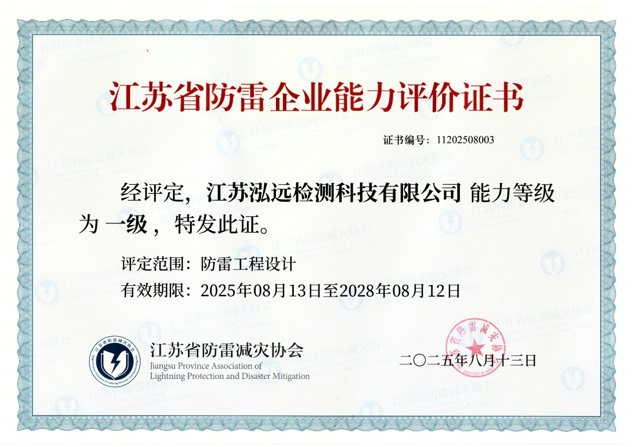 我公司为江苏省防雷协会副会长单位,具备雷电防护装置检测甲级资质证书,安全阀校验证书,公共场所检测、生活饮用水及其源水检测、防爆电器检测、气体报警仪检测CMA证书,质量管理体系认证证书等。自成立以来,已连续多年获评江苏省防雷协会优秀会员单位,参与起草多部防雷行业技术规范。